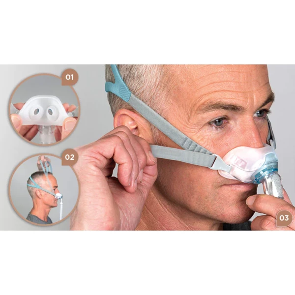 VisiBlue. Blue highlights incorporated into the mask indicate key components to assist patients with daily mask use.